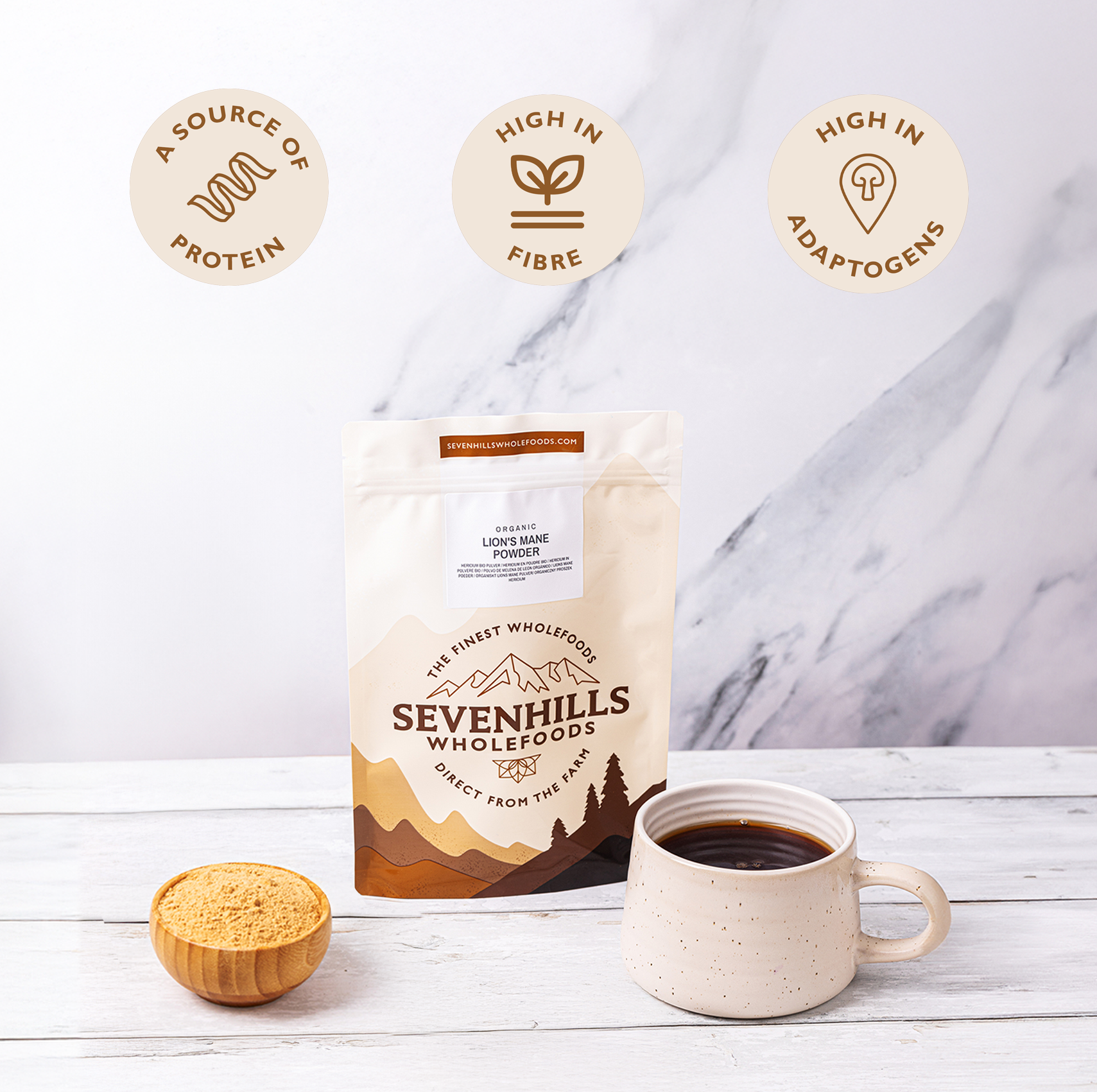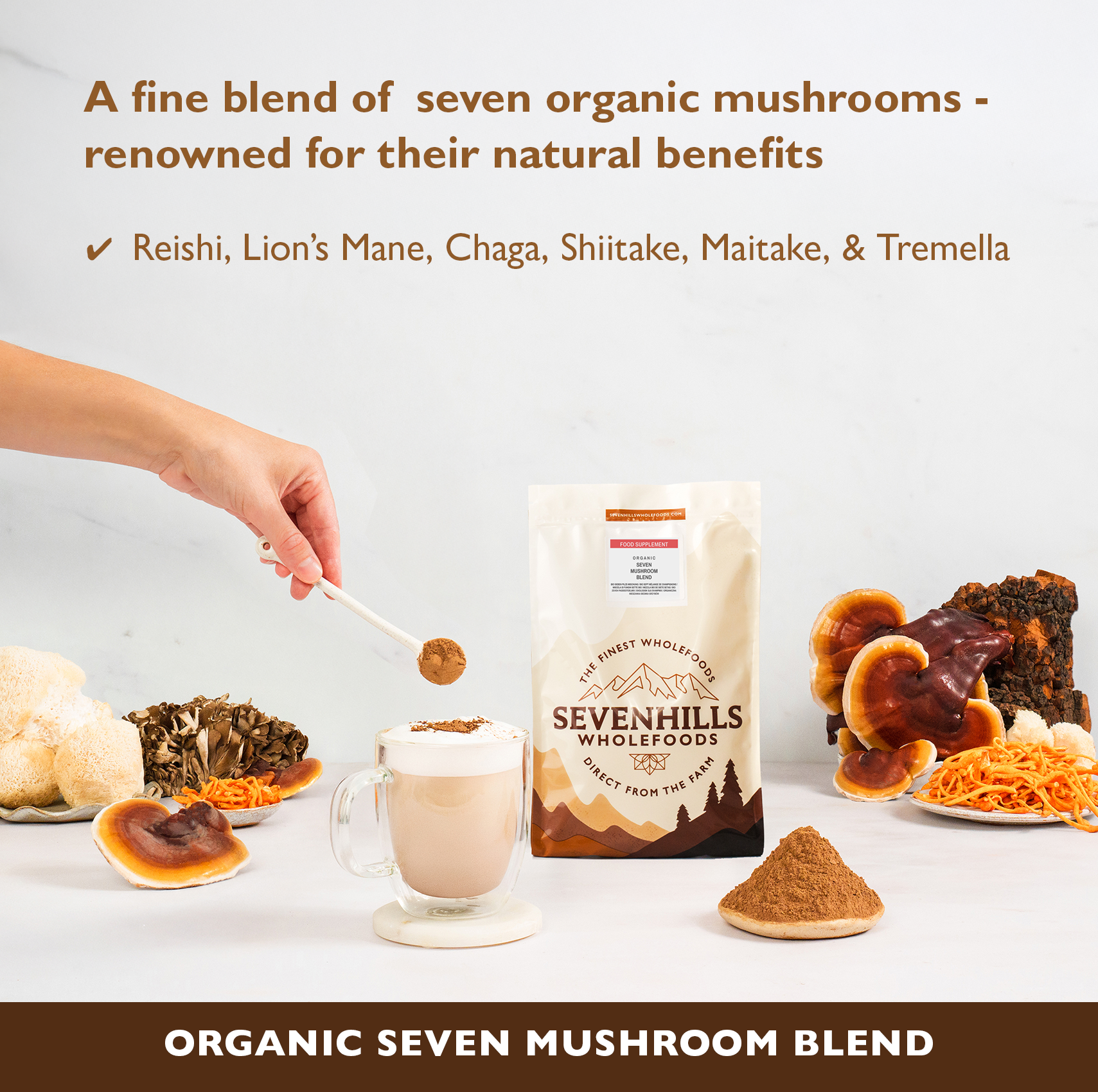 Organic Cacao Powder, Organic Maca Powder, Organic Lion's Mane Mushroom Powder, and more.