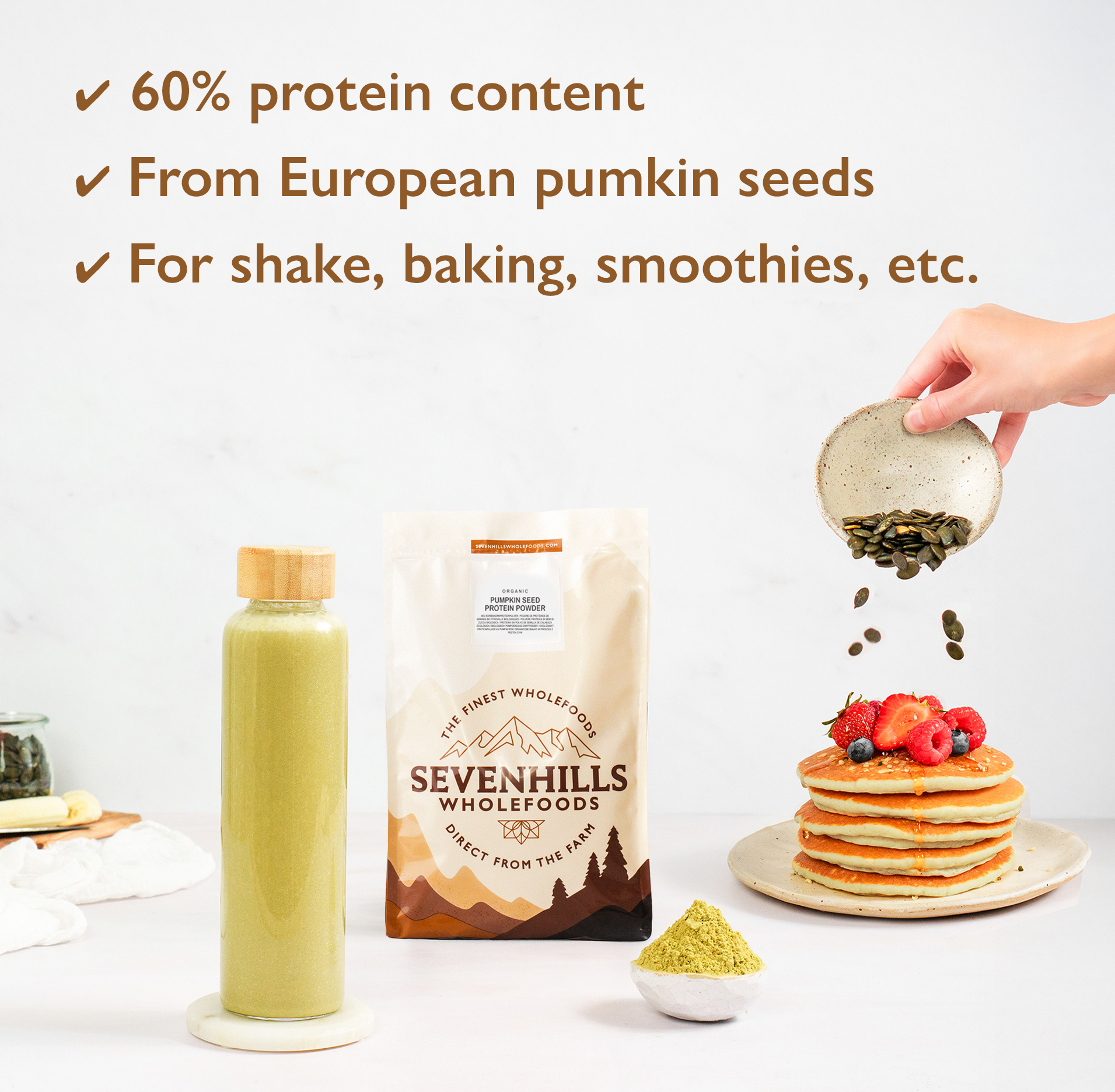 Our Organic Pumpkin Seed Powder is an excellent natural source of Vegan Protein, providing 60g of Protein per 100g, and can contribute to the growth and maintenance of muscle mass. Our Pumpkin Powder has a nutty taste and smooth texture.