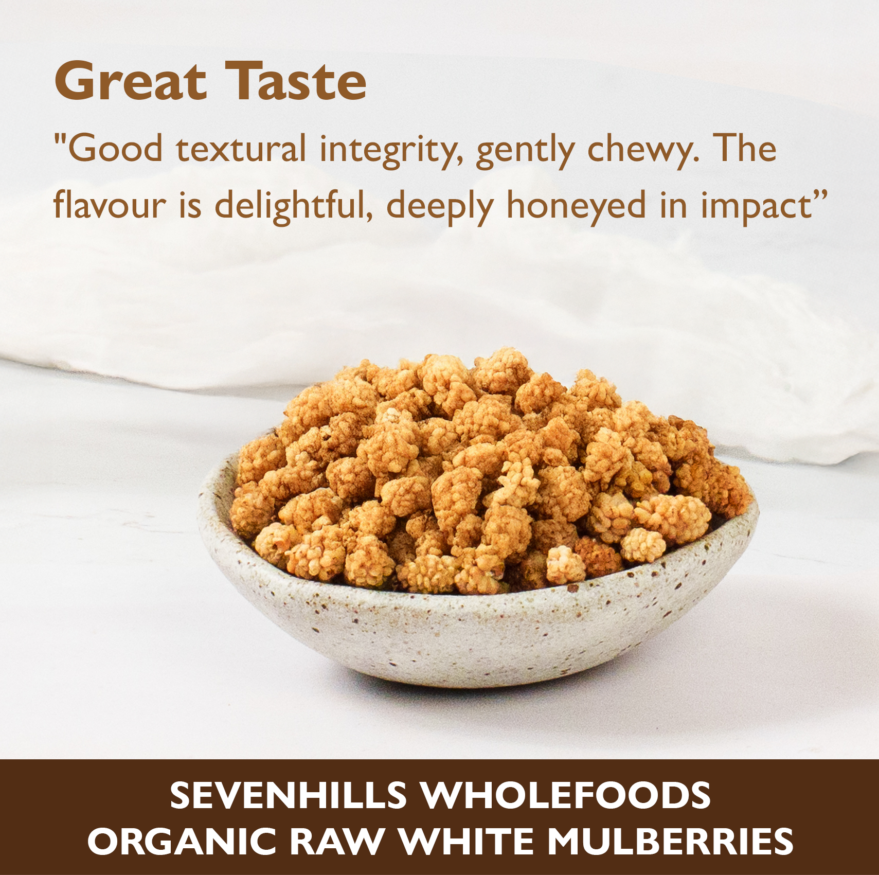 Our Organic White Mulberries are hand-harvested in Turkey, where we carefully select only the finest berries, each roughly the size of a grape. Our white mulberries are processed at low temperatures to preserve nutritional content.