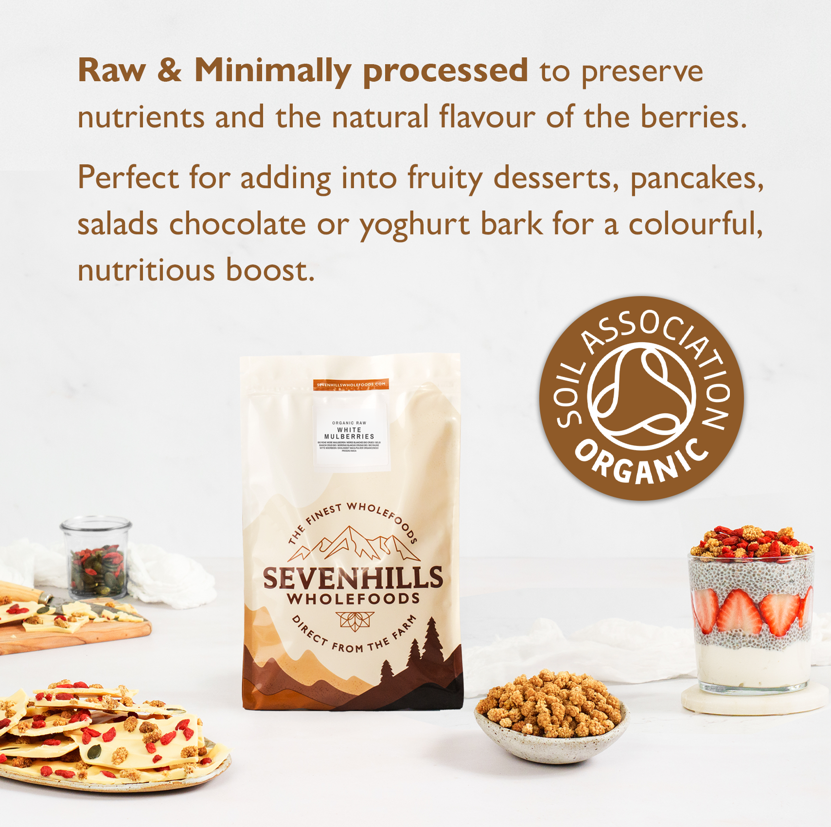 Sourced organically and dried carefully to retain their natural flavour and nutrients, these mulberries are a delicious way to enjoy a wholesome, naturally sweet superfruit with every bite.